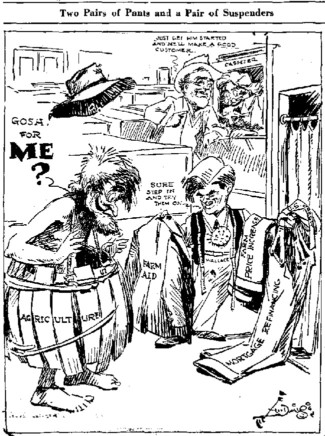 1) Do any necessary research on New Deal farm programs and identify the four individuals portrayed in the cartoon.