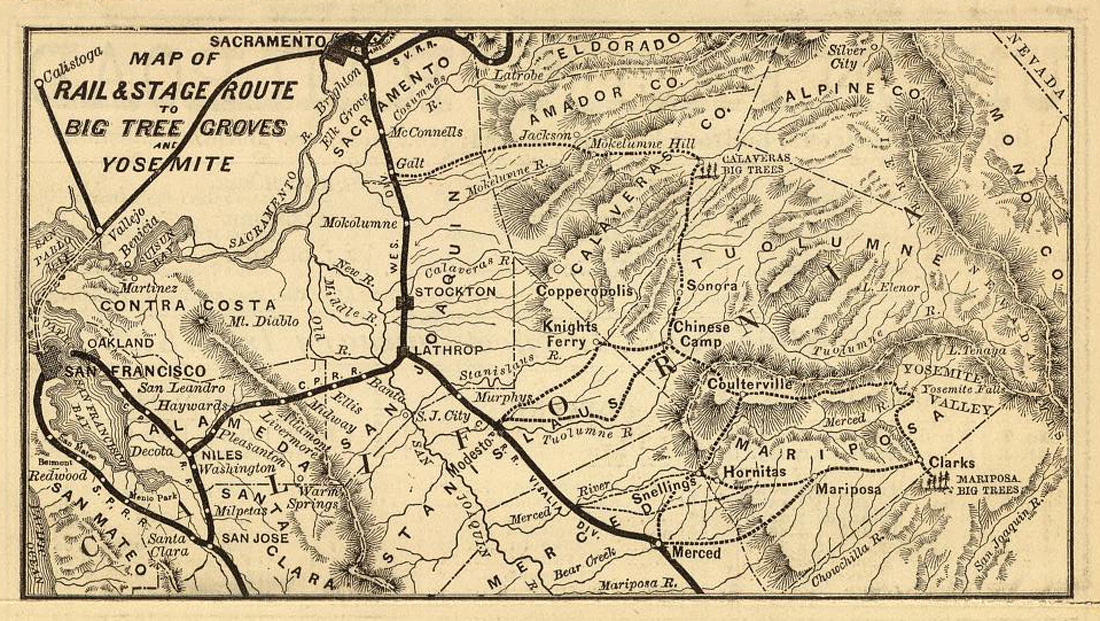 The political muscle needed to create a new Yosemite National Park brought about a marriage of interests that had also been important in the creation of Yellowstone. Preservationists like John Muir actively worked with the Southern Pacific Railroad and its political supporters in the California congressional delegation. Yosemite, like Yellowstone before, was a desirable destination and the railroads provided the means to get there. The lobbying pressure brought by the railroad was very important in causing Congress to act in October of 1890 to preserve the greater Yosemite region. Yosemite Valley, though, was left in the control of the state of California. Local agricultural, mining, transportation, and hospitality interests were still too big an obstacle in the California state legislature for a bill returning Yosemite Valley to the federal government to pass. Getting to Yosemite was no easy matter. The trip from San Francisco took several days as suggested in the following 1871 map and description from the Central Pacific Railroad.